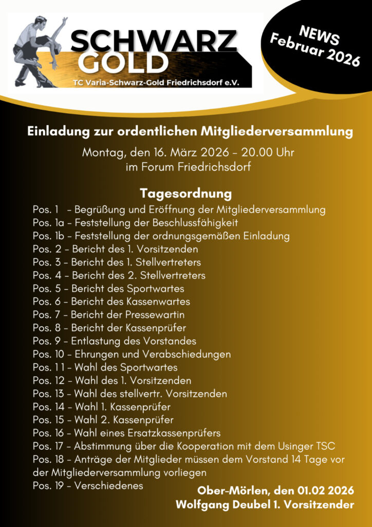 Feb. 02 2026 Aus Einladung zur ordentlichen Mitgliederversammlung am 16. März 2026 Von kvs Beitragsnavigation Vorheriger BeitragZurück Trainingsplan 1. Quartal 2026Nächster BeitragWeiter Salsa & Bachata am 10. Februar 2026